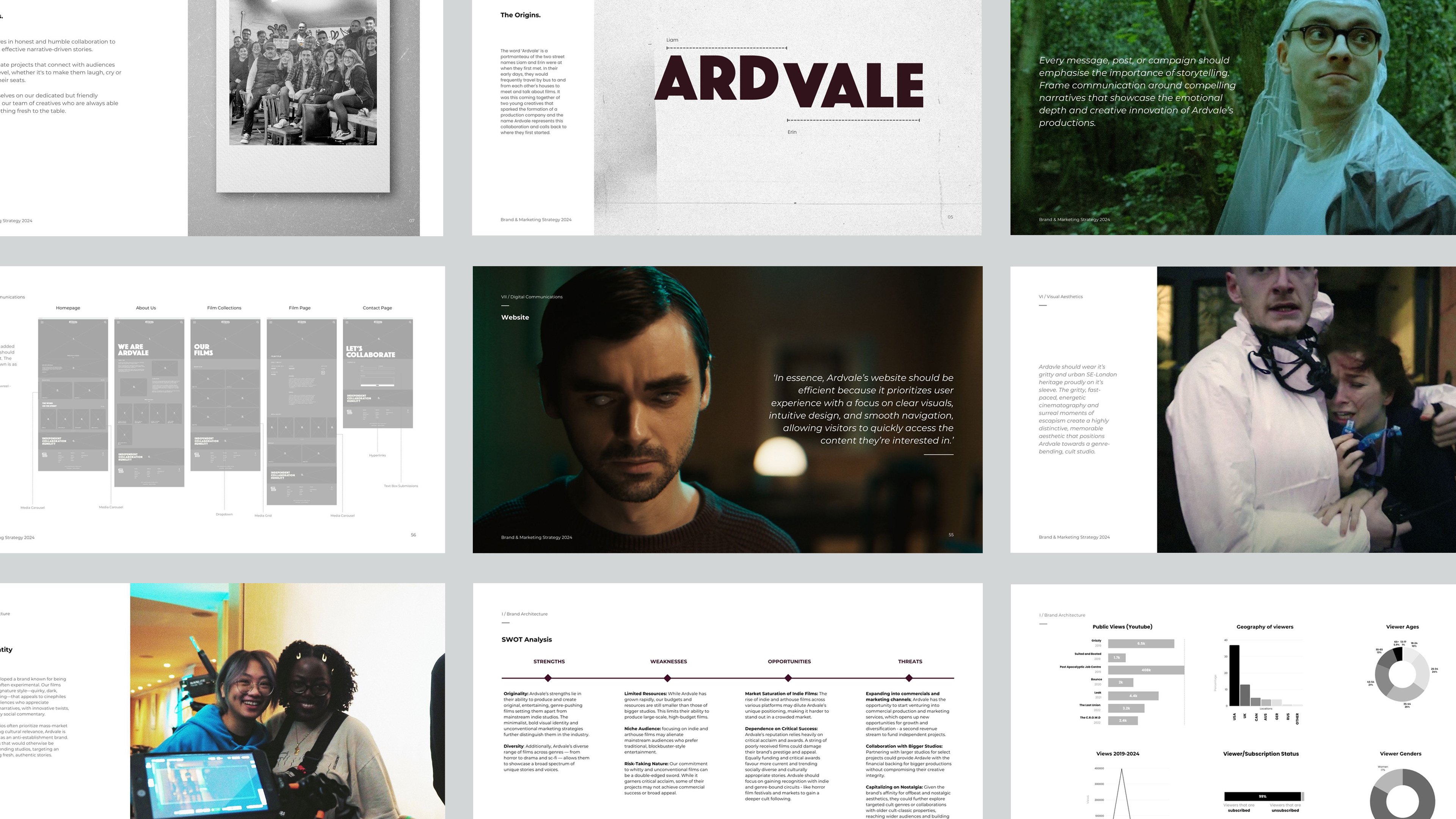 Drawing inspiration from Ardvale's portfolio and heritage, we crafted a brand environment confident in adopting an edgy, artsy, and experimental tone. The brand reflects the quirky, dark, and genre-defying nature of Ardvale's films, appealing to cinephiles and younger audiences who appreciate unconventional narratives with innovative twists, humour, and witty social commentary.